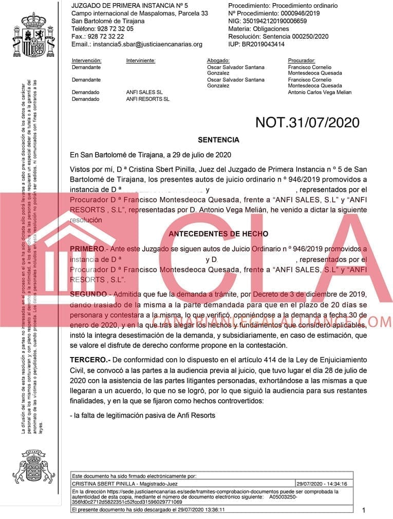 Today the Court of the First Instance SBT No5 again declared our clients’ contract with Anfi null and void.